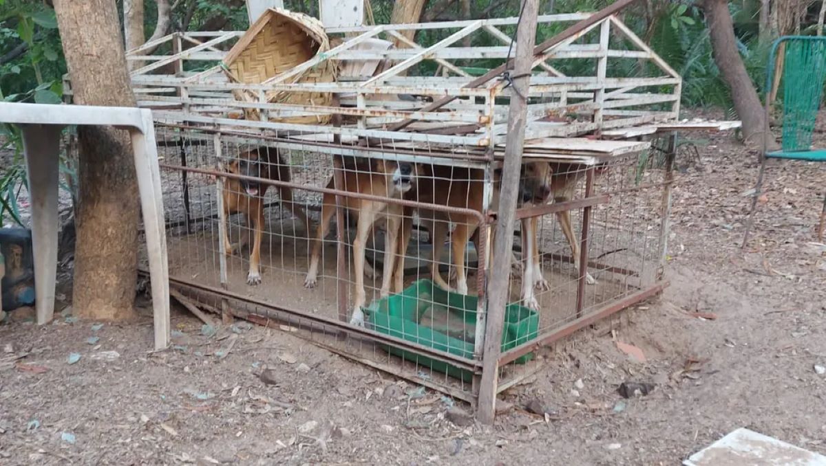 No local, os policiais encontraram cinco cães presos em uma mesma jaula, dois outros presos em jaulas distintas e, ainda, um amarrado com uma corda em uma árvore.