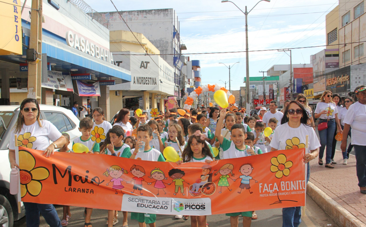 Na manhã desta sexta-feira (16), a Prefeitura Municipal de Picos realizou a tradicional caminhada da campanha Maio Laranja, mobilização nacional pelo enfrentamento ao abuso e à exploração sexual de crianças e adolescentes. A atividade foi promovida por meio da Secretaria Municipal do Trabalho e Assistência Social e reuniu centenas de participantes em um percurso que teve início em frente à Igreja do Sagrado Coração de Jesus, seguindo até a Praça Josino Ferreira, no centro da cidade.