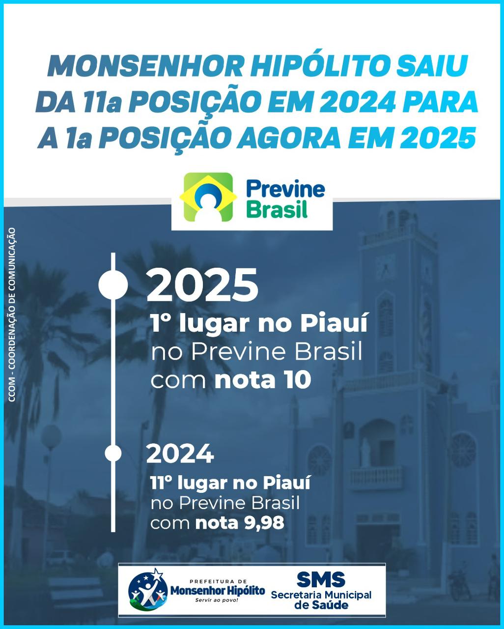 Em 2024, Monsenhor Hipólito ocupava a 11ª posição no ranking estadual. Com um trabalho contínuo, estratégico e humanizado, a Secretaria Municipal de Saúde conseguiu um avanço significativo, elevando o município ao topo do ranking em 2025.