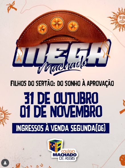O Colégio Machado de Assis, de Picos, confirmou o grande sucesso de vendas para a Revisão Mega Machado, o tradicional aulão intensivo de preparação para o Exame Nacional do Ensino Médio (ENEM). O evento, aguardado pelos estudantes que vão prestar o ENEM, será realizado nos dias 31 de outubro e 01 de novembro no auditório do Machado Internacional, localizado no bairro Canto da Várzea.