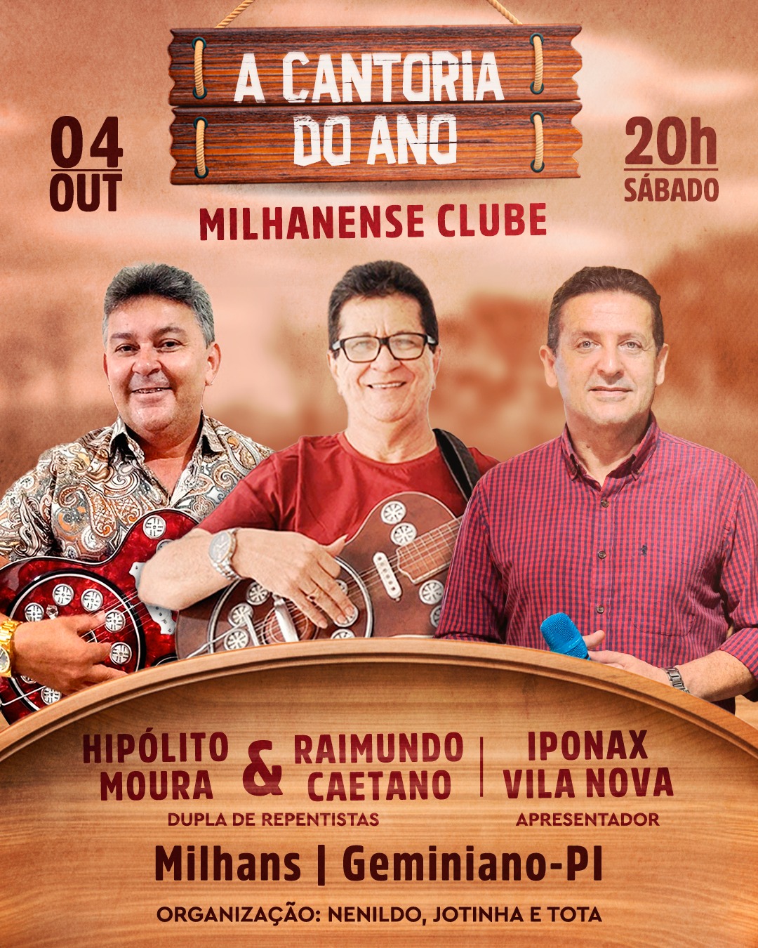 “Essa Cantoria do Ano já está na sua quarta edição e o nosso objetivo principal é manter essa cultura viva, principalmente aqui no Piauí. O Nordeste inteiro preserva essa tradição, principalmente Pernambuco e Paraíba, e o nosso estado não poderia ser diferente. O Hipólito Moura é filho do Piauí e não podemos deixar que essa cultura caia no esquecimento. Já realizamos edições com nomes como Luciano Leonel, Zé Viola e Jaciel Rufino, sempre ao lado do Hipólito Moura. Agora, trazemos ele junto com Raimundo Caetano e ainda contamos com a apresentação de Iponax Vila Nova. Temos certeza de que será mais uma noite inesquecível”, destacou.