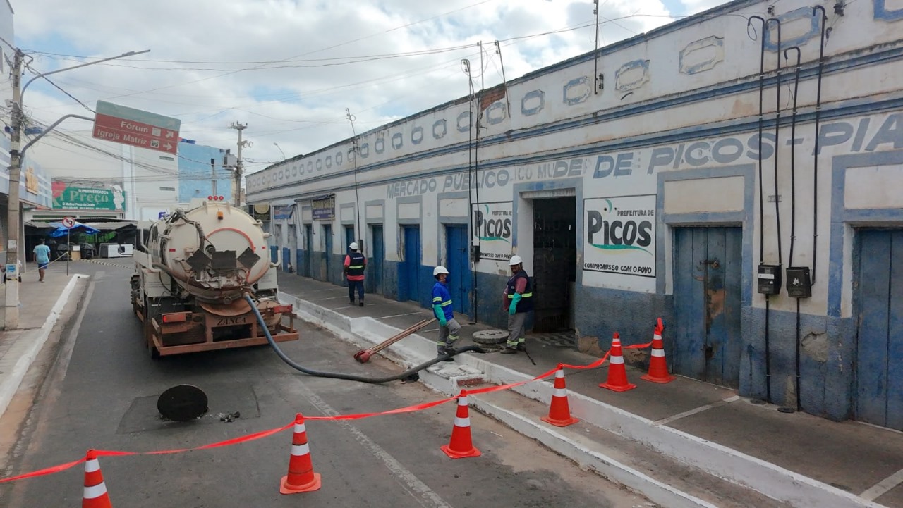 A Águas do Piauí realizou limpeza preventiva da rede coletora de esgoto que atende o Mercado Público Municipal de Picos, localizado no centro da cidade. A revitalização completa de toda a rede de esgoto e instalação do PV (poço de visita) faz parte do conjunto de melhorias contínuas no sistema de saneamento de Picos e teve como objetivo reforçar a eficiência do sistema e garantir mais segurança sanitária para os permissionários.