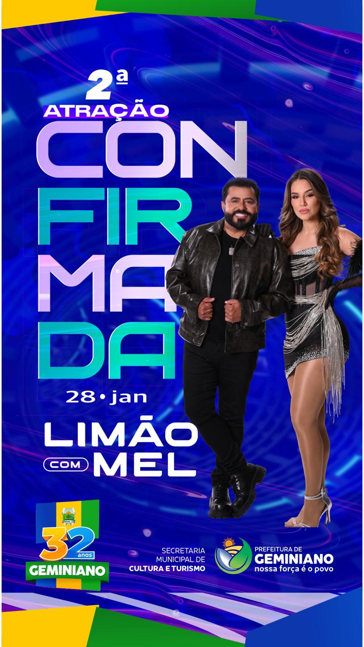 A Prefeitura Municipal de Geminiano segue anunciando as novidades para a grande festa de comemoração dos 32 anos de emancipação política da cidade. Nesta quinta-feira, 08 de janeiro, a gestão municipal confirmou a segunda atração da noite: a consagrada banda Limão com Mel.