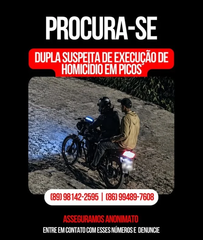 Na imagem, a dupla aparece em uma motocicleta e é procurada por participação no crime, tratado como execução. A polícia pede ajuda da população para identificar os suspeitos.